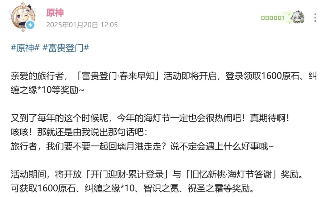 活动时间是从2025年1月22日-2025年2月11日,在该活动期间,将开放「开门迎财·累计登录」与「旧忆新桃·海灯节答谢」奖励,旅行者们还可以获得智识之冕、祝圣之霜等奖励。